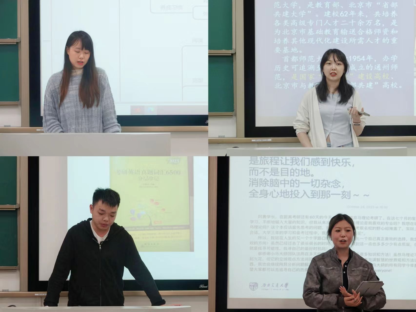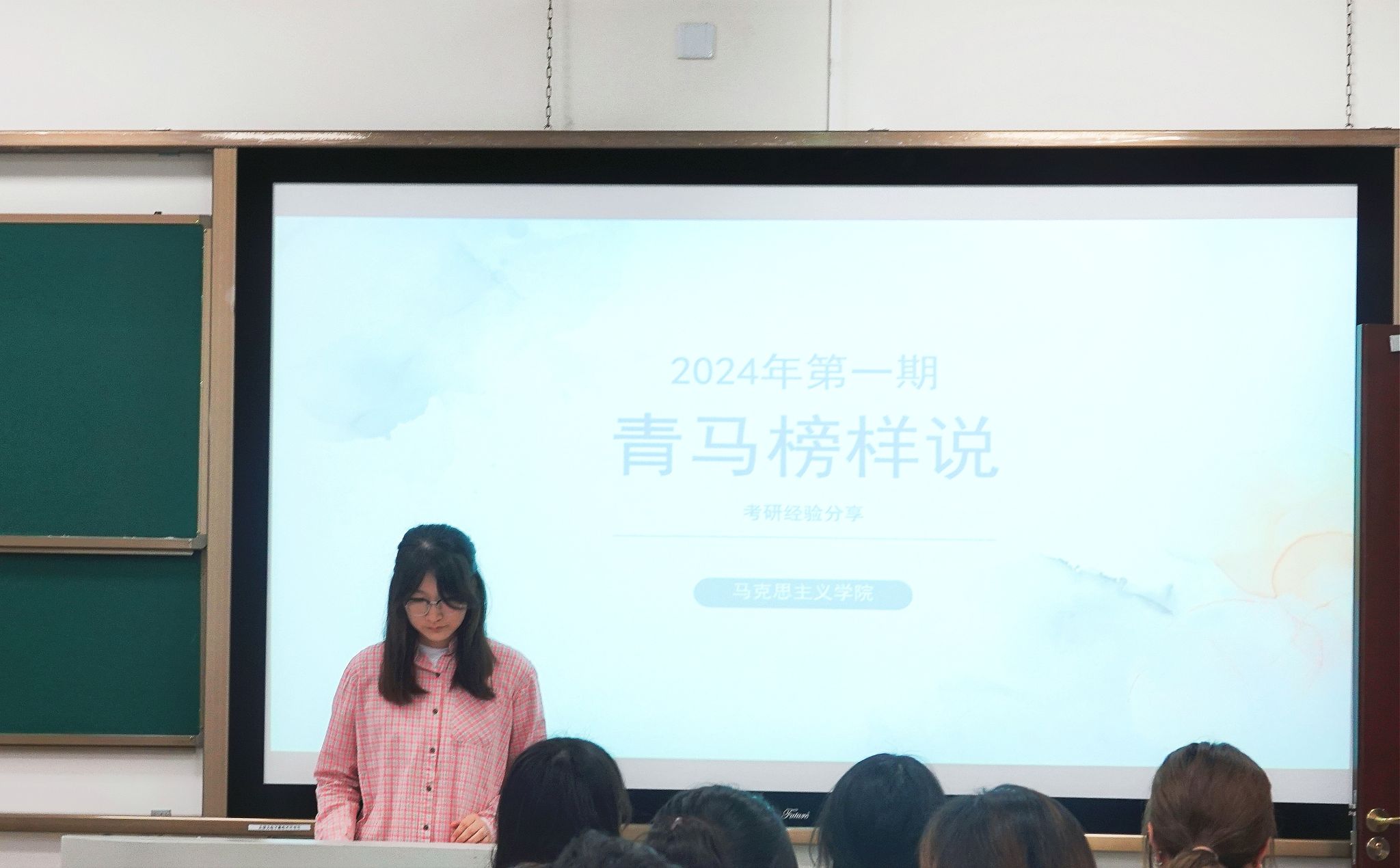 在X30609举办了2024年“青马榜样说:考研择校与复习经验分享”活动,本次活动邀请了在2024年考研中取得优异成绩的左珈弋、马祎涵、赵鹏、古璨四位同学作为分享嘉宾。学院党委副书记邓秀芸,本科生辅导员杜晓林、赵子涵出席此次活动,大三同学共同参与。