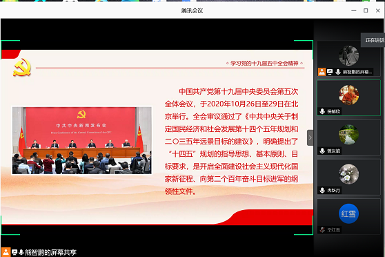 本次支部活动由熊智鹏主持,同学们集体学习关于“规划《建议》起草”、“规划《建议》亮点”、“规划《建议》突出民生议题”、“双循环的新发展格局”以及“如何实现2035年远景目标”的相关精神;学习中深刻体会党的十九届五中全会站在“两个一百年”奋斗目标的历史交汇点,擘画发展蓝图、规划实践路径、作出战略部署,为夺取全面建设社会主义现代化国家新胜利注入强大思想和行动力量。随后,针对党的十九届五中全会精神,学生们发表了在线学习感悟,并讲述了自己所做的工作,党员祝郁欣同学向同学们分享了学习心得。