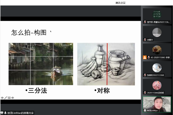 随后,林茂老师就摄影应该拍什么、怎么拍展开进一步地讲解。在后续的讲解中,林茂老师从构图的绘画步骤、角度、光影、时机、均衡等方面详细介绍了摄影的技巧,并鼓励同学们探索自己的摄影风格,不必过于机械,让同学们对摄影方法和技巧有了充分的认知。