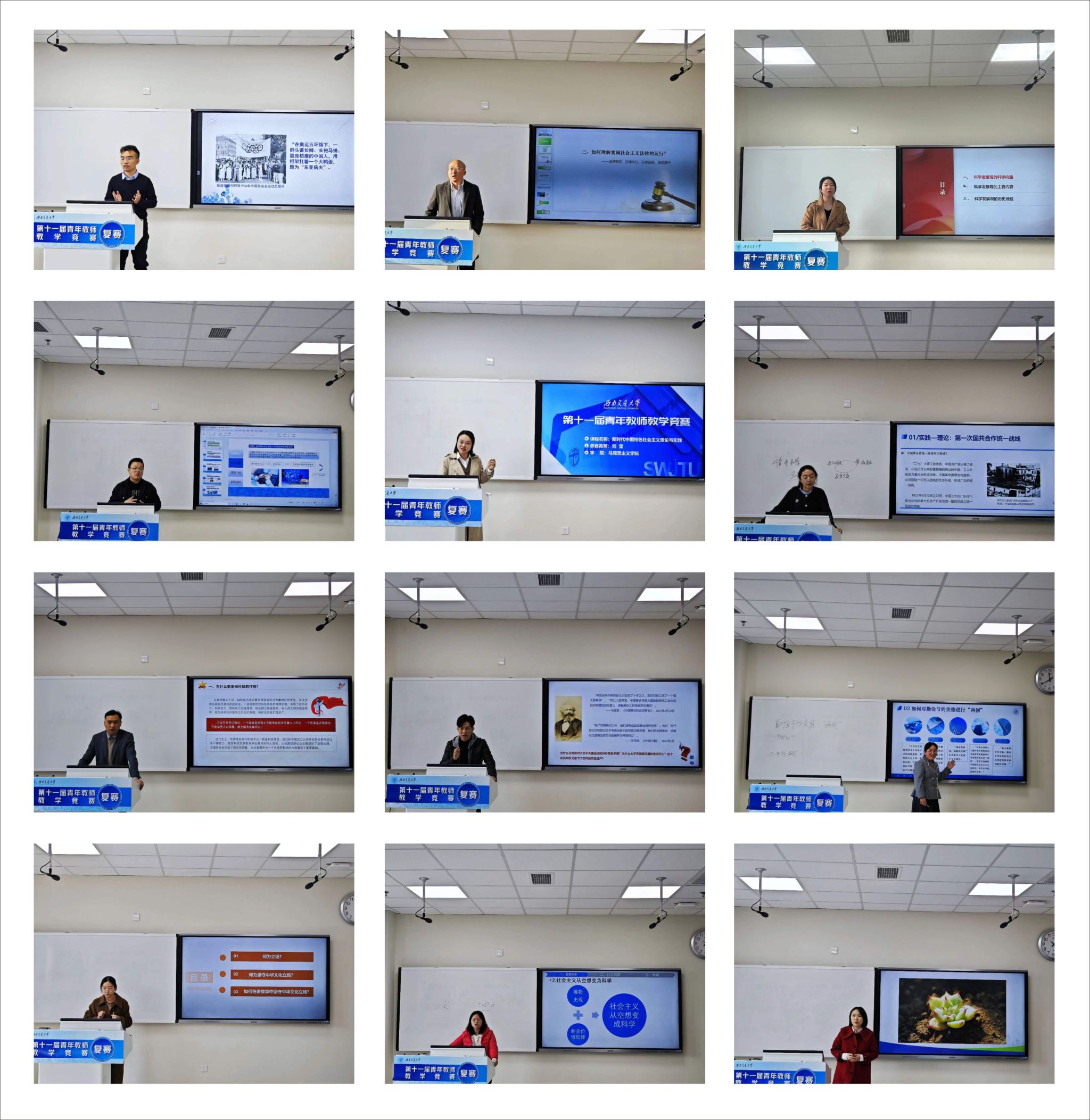 本次思政组复赛于2023年11月30日8:30在X30311教室准时开始,本场复赛邀请了我院李学勇副院长、谢瑜副院长等5位专家评委到场。比赛开始前由李学勇副院长宣读了比赛顺序以及评分标准,12位老师依次上台讲授课程。老师们分别以“新中国初期四川禁烟毒”、“社会主义法律的运行”、“科学发展观”、“数字资本主义批判及其意义”、“情理法:交锋与交融”、“毛泽东思想形成发展的历史条件”、“加快实现高水平科技自立自强”、“如何评价太平天国农民起义”、“传承中华传统美德”、“坚守中华文化立场”、“讲好多彩中国故事”等为题目进行了精彩的讲解,对知识点进行了深入的阐述和细致的分析。