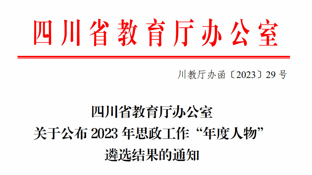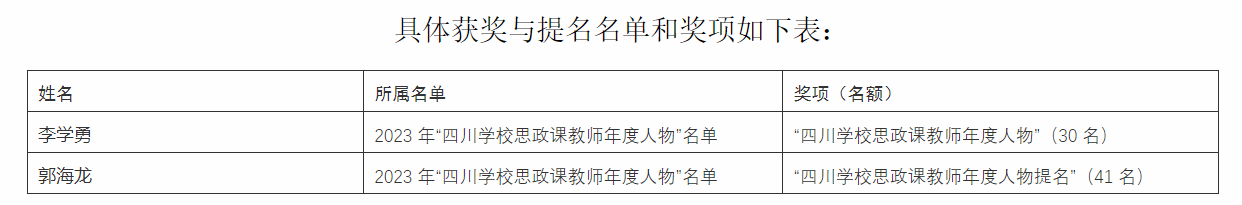 2023121日,中共四川省委教育工委、四川省教育厅公布了2023年思政工作“年度人物”的评选结果。我院李学勇郭海龙两位教师从众多优秀教育工作者中脱颖而出,荣获相关奖项与提名。