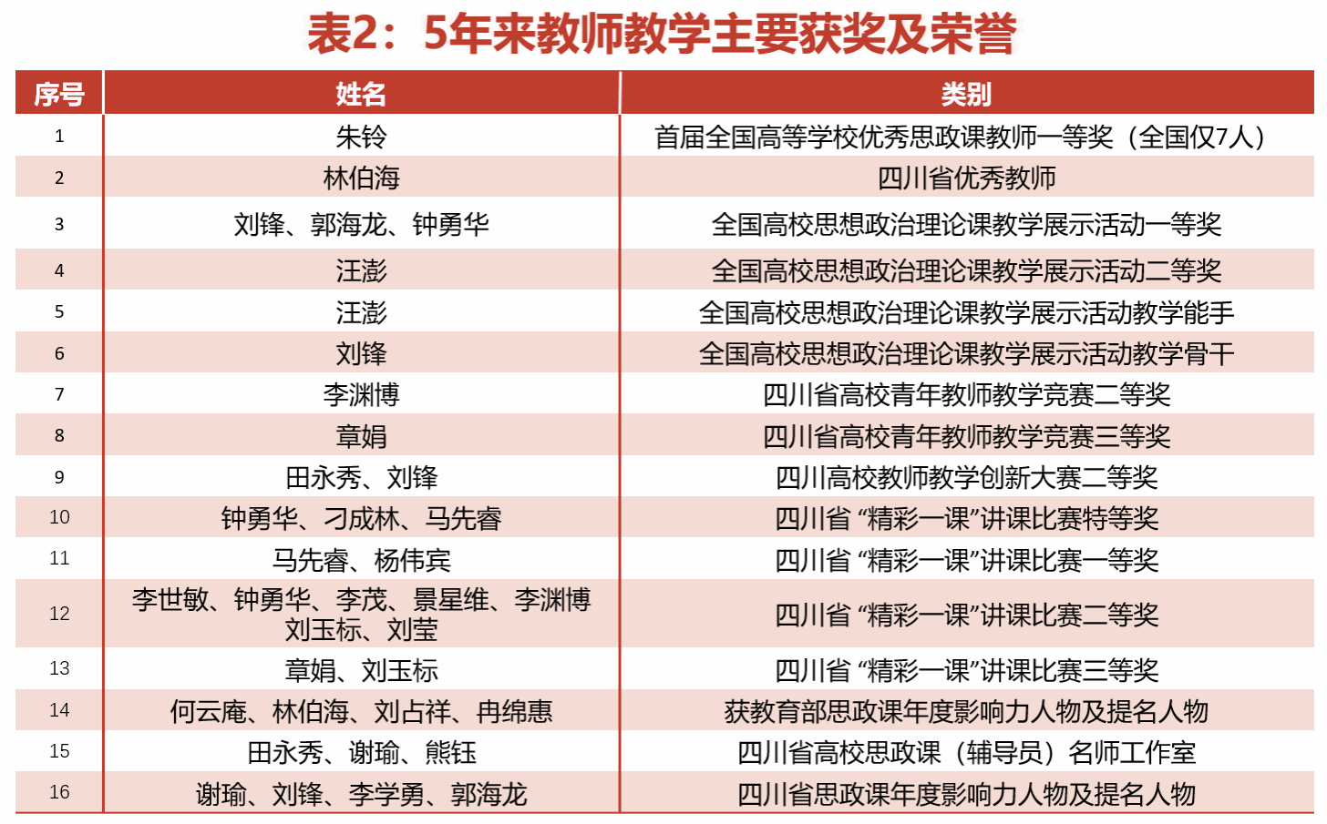 和优秀教学科研团队重点选题2项、全国高校思政课教学方法改革项目择优推广计划项目3项、四川省高等教育人才培养质量和教学改革重大项目3项、重点项目4项;获国家教学成果奖二等奖1项(参与)、四川省教学成果一等奖1项,二等奖1项、三等奖1项;中央电视台新闻联播、人民日报、光明日报、中国教育报、人民网、学习强国等多次报道学校思政课教学改革创新的做法、成效。