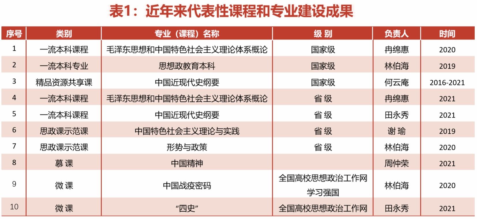 学院围绕讲好思政课,以课堂教学为中心,以启智润心、沟通心灵为目标,着力打造思政课“金课”,全力推动思政课内涵式建设、高质量发展。通过努力,在前期2门国家级精品课、1个国家级教学团队的基础上,通过了首批国家精品资源课的验收1门,成功获得国家一流本科课程1门,省一流课程2门,省思政课示范课2门。“中国近现代史纲要”课程先后在爱课程网站、智慧树网站上线。其中在智慧树网站上线6学期以来,选课学校10所,公众学习所属学校249所,学习者近7万人。