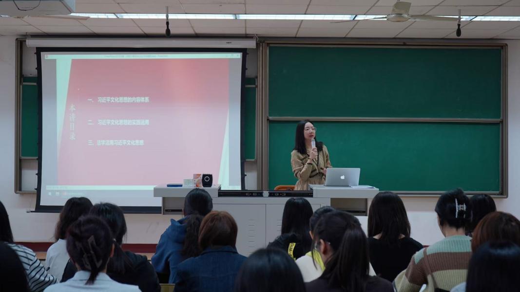 第二版块“习近平文化思想的实践运用”由方玲教授主讲。方玲结合自己在不同岗位履职的丰富经验,从生活小事、工作小节出发,用大量案例生动讲述了习近平文化思想的具体表现和运用方法,耐心解答了几位同学的思想困惑,有效增进了同学们对习近平文化思想的理解。方玲强调,积极向党组织靠拢、争取早日入党和坚持党的领导是青年学生应有的追求和信仰,因为真理的味道很甜,能够引领我们走向光明的未来;要坚守意识形态红线,谨防落入各种陷阱;还要有意识培养大局观、发展观、智慧观,脚踏实地做好本职工作,不断磨炼个人意志。