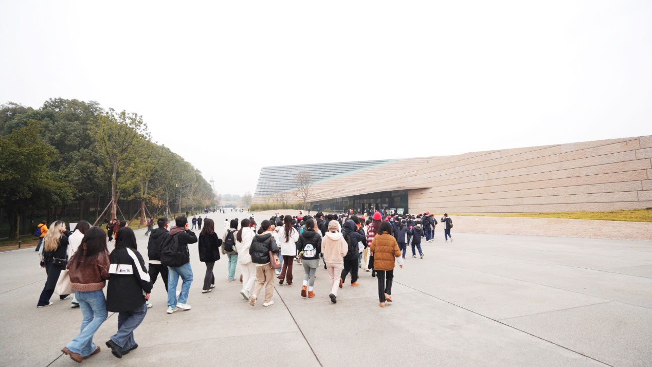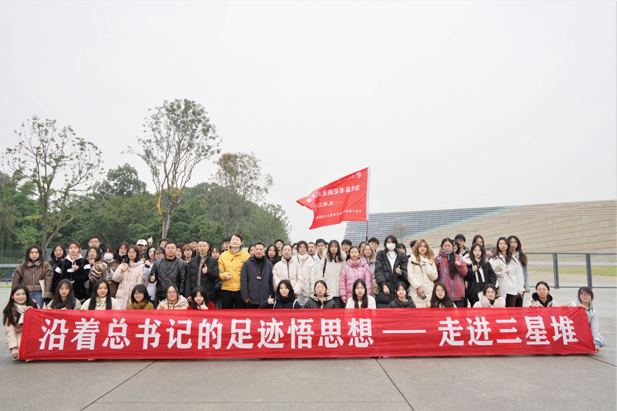 犀浦校区图书馆前升旗台旁乘坐大巴出发,于十点二十分左右到达三星堆博物馆。随后,全体师生在讲解员的带领下开启一场文明对话之旅。