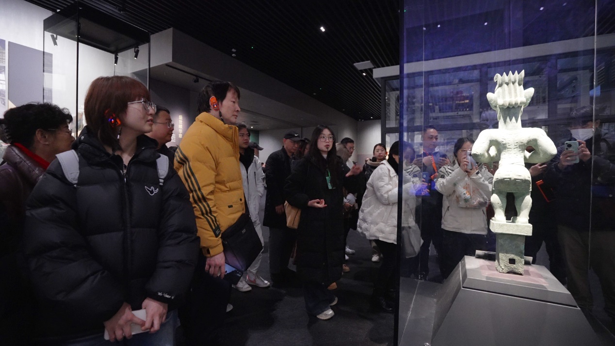 在世纪逐梦展览厅,学生们从初识三星堆到一眼见千年,目睹三星堆遗址百年奋斗史,解密三星堆遗址考古发现百年成就,体悟到“严谨求实、艰苦奋斗、敬业奉献的优良传统,继续探索未知、揭示本源”的考古精神;在巍然王都展览厅,学生们探源三星堆文明,透过文物窥探三星堆古国经济社会发展、权力结构、文化交流,感受中华文明魅力和突出特性;在天地人神展览厅,学生们感受古蜀先民浪漫的想象力和非凡的创造力,于器物中认识中华优秀传统文化;在互动体验厅,学生们兴致盎然,上前拍照、驻足观看、视频记录,沉浸式对话古蜀文明,由衷感到作为中国人的自信自豪……