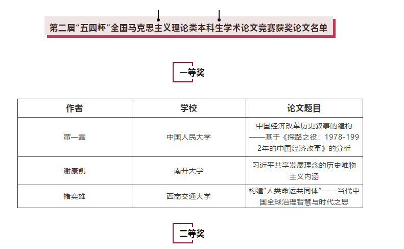 近日,我院思想政治教育专业2018级本科生褚奕雄同学获得由教育部高等学校马克思主义理论类专业教学指导委员会主办、中国人民大学承办的第二届“五四杯”全国高校马克思主义理论类本科生学术论文竞赛一等奖。褚奕雄同学已连续两年获得该奖项。
