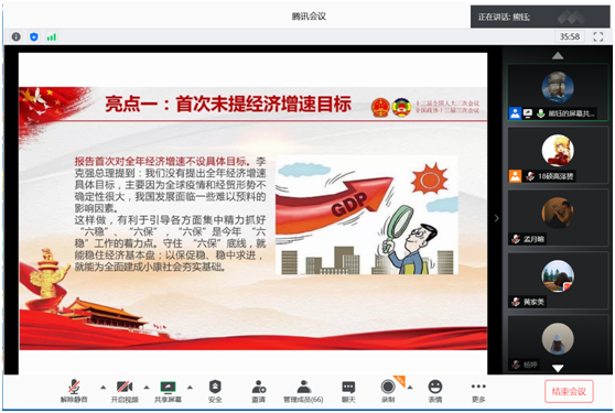 2020年7月9日上午10:00,学院在腾讯会议平台上开展了以“解读政府工作报告”为专题的党课。本次党课由学院党委副书记、学工组组长熊钰老师主讲,学院辅导员、全体学生党员参与了本次党课学习。