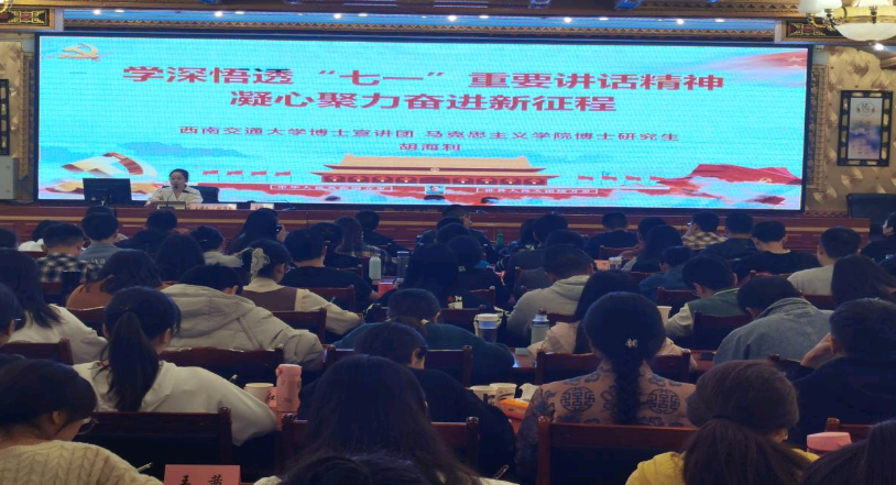 7月23日,四川省党史学习教育宣讲团、“蓉耀青年”成都大学生新思想宣讲团、西南交大博士宣讲团学生团长邢斐赴川藏铁路沿线现场宣讲伟大建党精神。7月26日,西南交大博士宣讲团成员冷书恒赴眉山市现场宣讲革命精神。7月27日胡海利赴甘孜州民族干部学校现场宣讲“七一”重要讲话精神。8月25日,胡海利赴西南交大地环学院线上宣讲“七一”重要讲话精神。