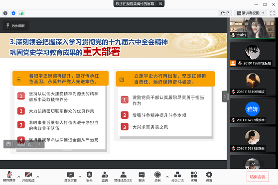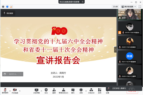 1月13日19:00,为深入学习贯彻党的十九届六中全会精神和省委十一届十次全会精神,校团委副书记(学生兼职)、成都市委宣讲团第二十一分团成员龚禹竹通过腾讯会议线上开展以“学习贯彻党的十九届六中全会精神和省委十一届十次全会精神”为主题的宣讲报告会。本次宣讲由91国产