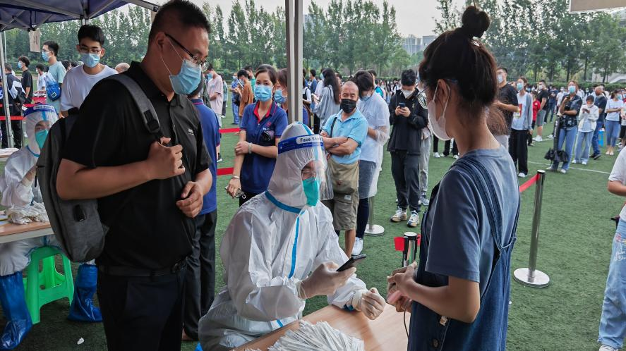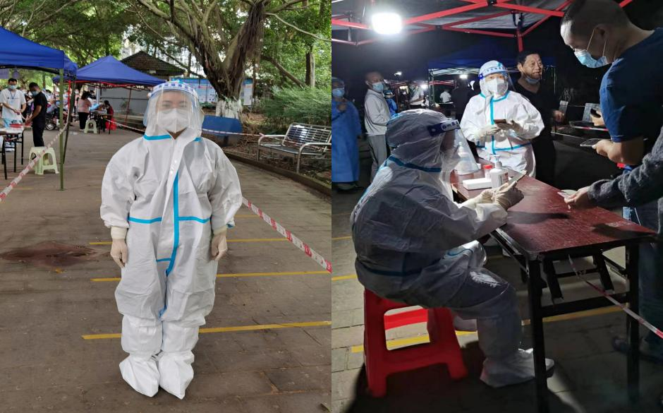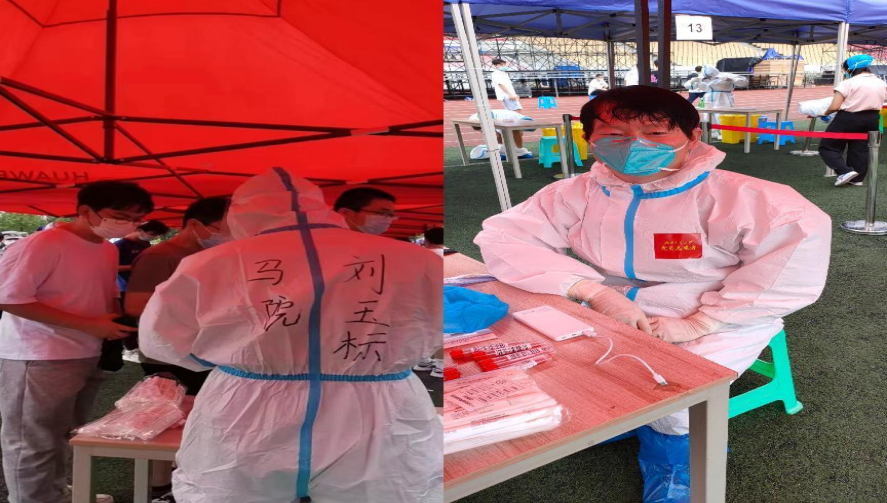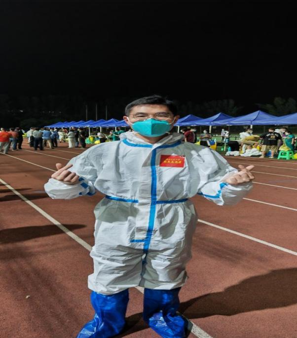教师党员志愿者刘玉标、杨桓、门满洲老师迅速变身“大白”,配合学校做好核酸检测工作事宜。秋已至,夏未央,初秋的午后,依旧炎热,面对激增的检测人数和紧迫的检测时间,他们没有丝毫退缩,坚守工作岗位,耐心细致参与核酸检测扫码、贴试管码、答疑解惑、维持核酸检测秩序等工作。9月2日的志愿服务从上午开始,一直到微凉的深夜,即使在核酸网络系统暂停期间,学院教师党员志愿者们仍身穿防护服随时待命,他们与学校工作人员、医务人员并肩作战,用大爱筑起阻击疫情的防线。