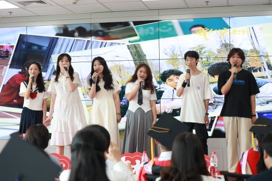 栀子花开、绿草如茵,毕业是纷繁回忆的重拾,是伤感与张扬的别离,更是新征途的郑重开始。《栀子花开》音乐响起,荧幕上播放的一幕幕学习生活画面再现在师生们眼前,千万个动人点滴,共同汇成了一条记忆的河流。同学们纯粹动人的歌声让人在聆听时能感受到空气中轻盈地飘出栀子花带来的阵阵清香。