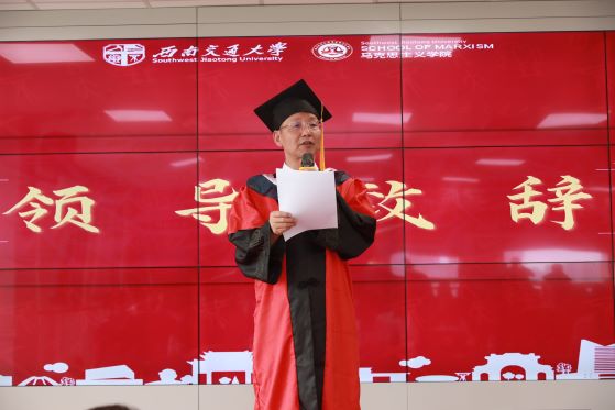 接着,邱海平院长为毕业生们送上毕业寄语。邱院长首先表示,在学校2023届毕业典礼暨学位授予仪式上,我院本科生吴昊代表本科毕业生发表毕业感言,让他感到十分开心与自豪。彼时天气阴沉但同学们的热情不减,今天阳光明媚,万物可期。邱院长代表学院对2023届毕业生们表示热烈祝贺和热情期待,庆祝同学们顺利完成学业迎来毕业,也期待同学们在未来的日子里继续谱写精彩华章。同时,邱院长对全体教职员工表示最忠心的祝贺和最诚挚的感谢。邱院长表示,希望马院学子始终坚持马克思主义武装自己、指导实践,潜心学习马克思主义的理论成果,用科学理论分析问题、用正确方法解决问题,用马克思主义的方法论认识世界、认识自我、认识他人,淡定从容、勇毅前行,希望大家成为马院永远的骄傲,祝愿毕业生们展翅高飞,永远幸福!