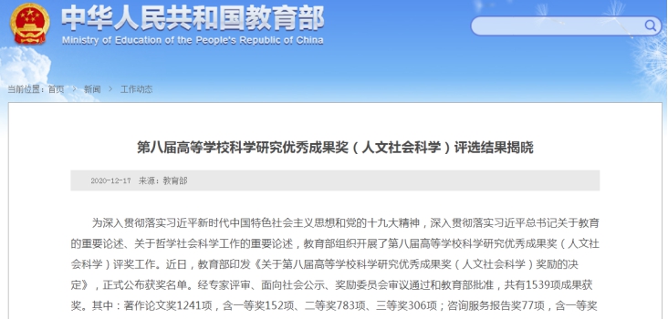 The 8th University Scientific Research Outstanding Achievement Award (Humanities and Social Sciences) is a major measure of the Ministry of Education to reward the outstanding achievements of philosophy and social science workers in universities, demonstrate the major theoretical and practical achievements of the social sciences of universities in serving the development of the Party and the country, and promote universities to accelerate the construction of philosophy and social sciences with Chinese characteristics, embodying the scientific research level of an institute and the winner.