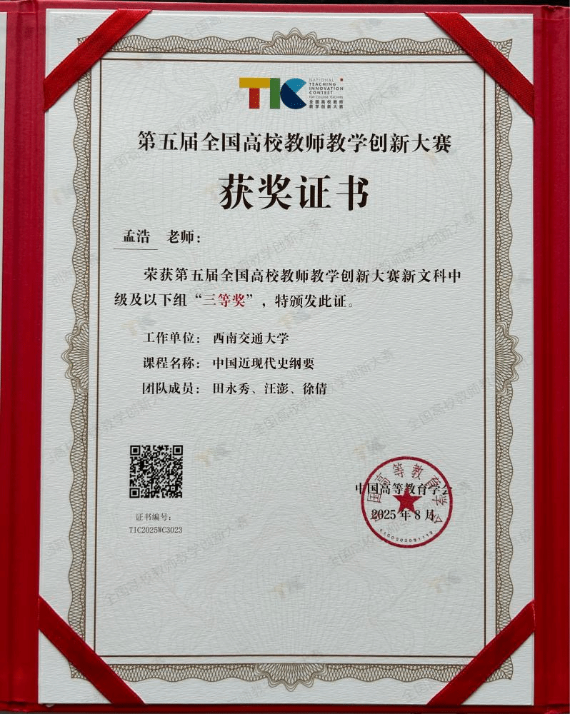 孟浩老师的参赛课程是“中国近现代史纲要”,学院“纲要”课具有深厚的学科根基,“05方案”以来,先后荣获国家级精品课、国家级教学团队、国家级精品资源共享课、省级精品在线课程、省一流课程等标志性成果。在稍早前的2025年四川省高校思想政治理论课中青年教师“精彩一课”讲课比赛决赛中,孟浩老师又为该课程增添一项省级特等奖。在课程的前期基础上,孟浩老师通过“教研融合·现实联结·情景再现”的创新模式,将前沿科研成果融入教学内容,构建学理纵深;强化历史与现实的联结,引导学生从历史中汲取智慧;通过故事化讲述、沉浸式体验等教学环节,增强课堂的亲和力和感染力,有效提升了学生的学习兴趣和参与热情。